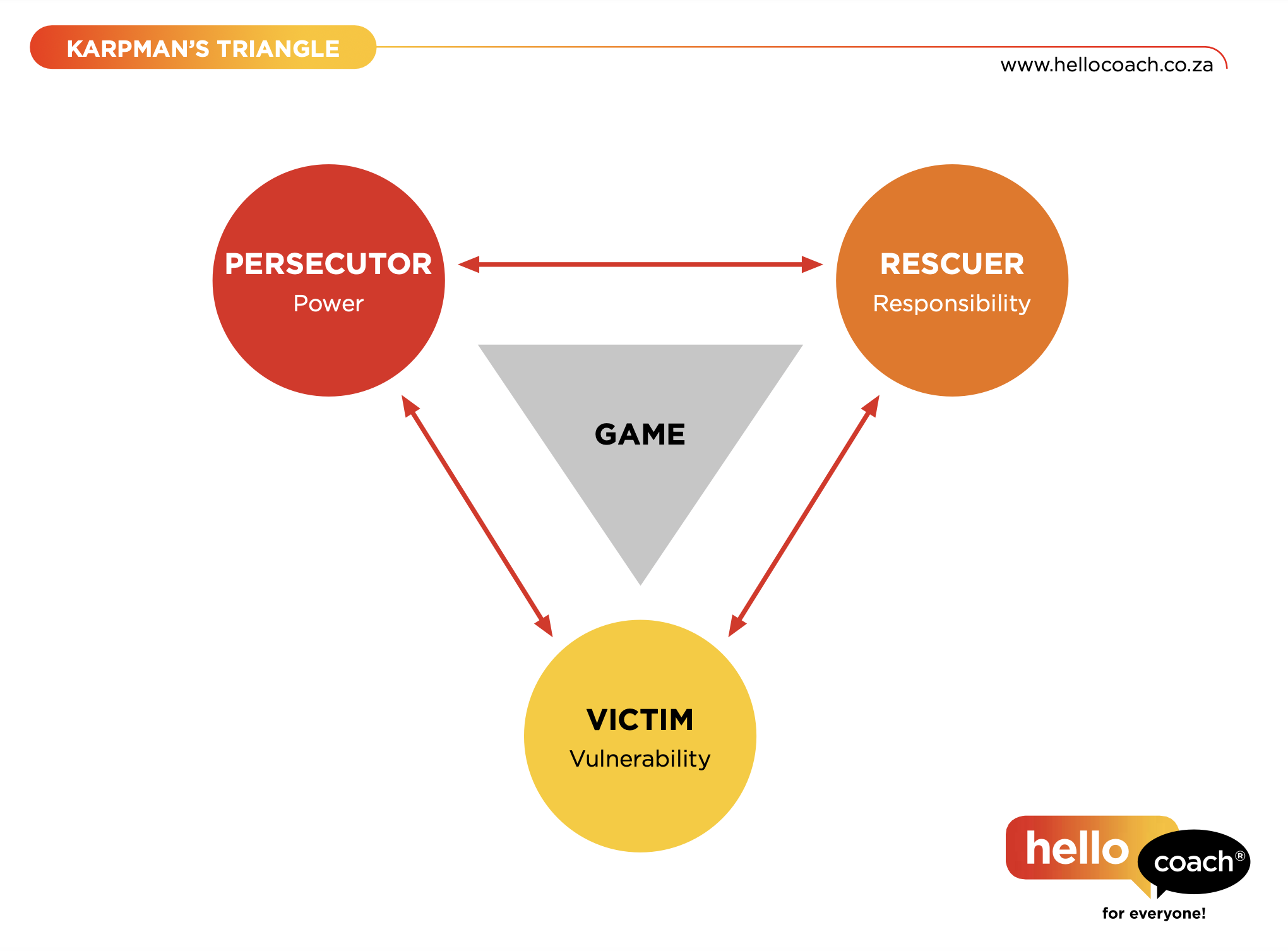 Karpman’s Triangle can affect relationships, work dynamics, and even self-view. Coaching helps clients recognise when they’re in one of these roles, enabling them to move beyond limiting patterns.
